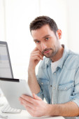 portret młodych mężczyzn zrelaksowany w biurze przy użyciu tabletu