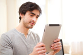 portret młodych mężczyzn zrelaksowany w biurze przy użyciu tabletu