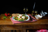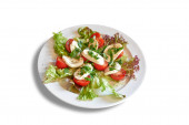 Sztućce na brązowym drewnianym stole i białym talerzu z pomidorami i mozzarellą