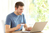 młody człowiek spokojny, płatności online kartą kredytową w rozkładaną