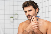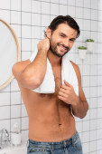 Zdjęcie "Mężczyzna bez koszuli uśmiecha się do kamery trzymając rurkę z kosmetycznym kremem w łazience " może być wykorzystywane do celów osobistych i komercyjnych zgodnie z warunkami zakupionej licencji Royalty-free. Obraz jest dostępny do pobrania w jakości wysokiej rozdzielczości do 5760x3840.