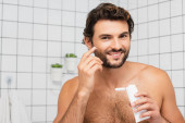 Mężczyzna bez koszuli uśmiecha się do kamery trzymając rurkę z kosmetycznym kremem w łazience