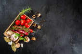 Surowy makaron z surowymi jajkami i warzywami na czarno. Przestrzeń kopiowania