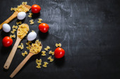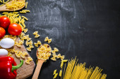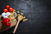 Surowy makaron z surowymi jajkami i warzywami na czarno. Przestrzeń kopiowania