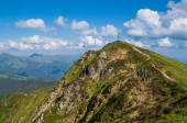 Letni grzbiet górski, kwiaty rododendronu i karłowate alpejskie krzewy. Góra Marmaros Pip Ivan, Karpaty, Ukraina.