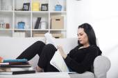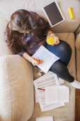 młoda blondynka w kratowej koszuli leży na kanapie z dokumentami i trzyma notatnik