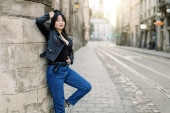 Szczęśliwa azjatycka brunetka siedząca przy stole w kawiarni na świeżym powietrzu. Młoda stylowa kobieta w dżinsach i skórzanej kurtce, odpoczywająca na świeżym powietrzu w kawiarni w starym europejskim mieście