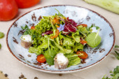 Smaczna świeża sałatka z mięsem i warzywami na drewnianym tle