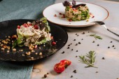 Mięso z warzywami, grzankami i sosem na tle drewna