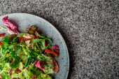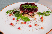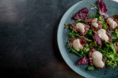 Mięso z warzywami, grzankami i sosem na tle drewna