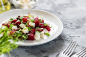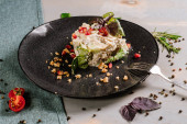 Mięso z warzywami, grzankami i sosem na tle drewna