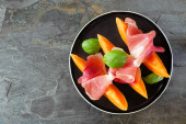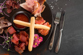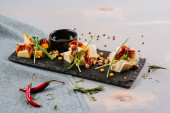 Naczynie z czerwoną, białą rybą, kawiorem i warzywami na drewnianym tle
