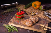 Naczynie z odmianą na wędzonym mięsie posiekanym na plasterkach ziół