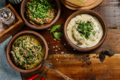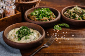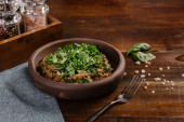 Naczynie z posiekanym mięsem z sosem i ziołami na drewnianym tle