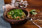 Naczynie z posiekanym mięsem z sosem i ziołami na drewnianym tle