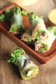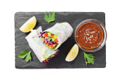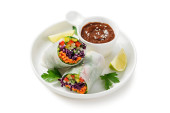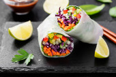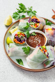 Zdjęcie "Wegetariańskie wietnamskie sajgonki z sosem z masła orzechowego, marchewką, ogórkiem, czerwoną kapustą i makaronem ryżowym. Wegańskie jedzenie. izolowany na białym tle" może być wykorzystywane do celów osobistych i komercyjnych zgodnie z warunkami zakupionej licencji Royalty-free. Obraz jest dostępny do pobrania w jakości wysokiej rozdzielczości do 5760x3840.