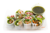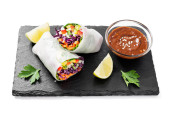 Wegetariańskie wietnamskie sajgonki z sosem z masła orzechowego, marchewką, ogórkiem, czerwoną kapustą i makaronem ryżowym. Wegańskie jedzenie. izolowany na białym tle