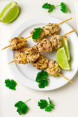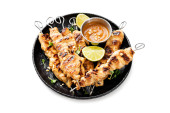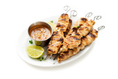 Grillowane szaszłyki z kurczaka satay z sosem z masła orzechowego izolowane na białym tle