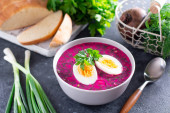 Lato Zimna zupa buraczana ze świeżymi warzywami i gotowanym jajkiem.