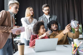 Szczęśliwi wielokulturowi współpracownicy rozmawiający przy stolikach w biurze z kolegami na tle, baner