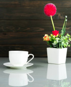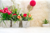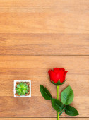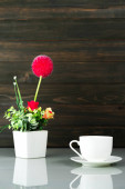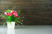 Sztuczny kwiat wazon bukiet nad stołem z drewna ściany tła
