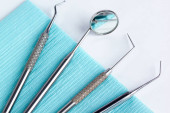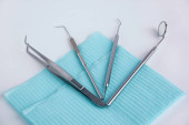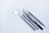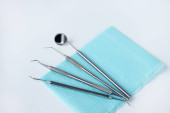 Grupa narzędzi stomatologicznych do leczenia zębów. Odizolowany na białym tle. Skopiuj miejsce na tekst.