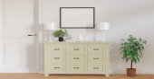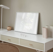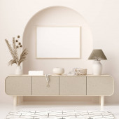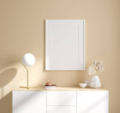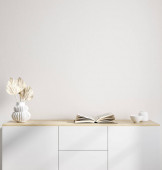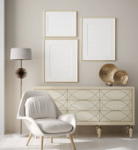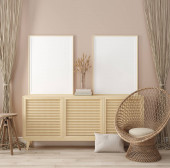 Ramka makietowa w tle wnętrza, pomieszczenie w jasnych pastelowych kolorach, styl skandynawski, renderowanie 3d