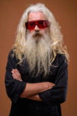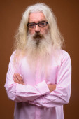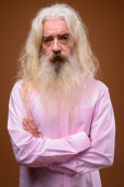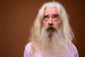 Studio shot przystojnego starszego mężczyzny z długą białą kręconą brodą i włosy odizolowane na białym tle