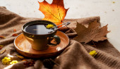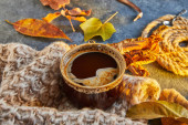 Jesień, jesienne liście, gorąca parująca filiżanka kawy i ciepły szalik na tle niebieskiego stołu. Sezonowa, poranna kawa, niedzielny relaks i martwa natura.
