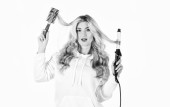 Wskazówki fryzjerskie.Kobieta z długimi kręconymi włosami używać lokówki. Ustawienie temperatury dla typu włosów. Dziewczyna urocza blondynka trzymać lokówkę. Wspaniała fryzura. Tworzenie pięknej fryzury z lokówki