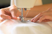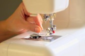 Przygotowuję maszynę do szycia do pracy. Widok z bliska.