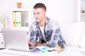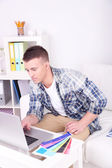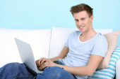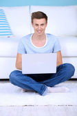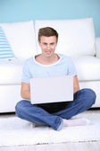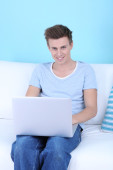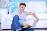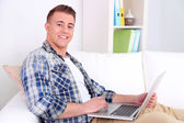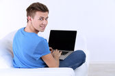 przystojny młody mężczyzna siedzi na kanapie z laptopem w pokoju