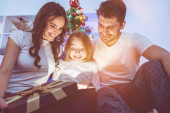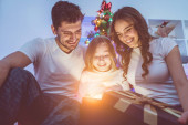 Szczęśliwa rodzina otwiera skrzynkę z światłem. wieczorna noc