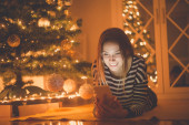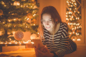 Zdjęcie "Szczęśliwa dziewczyna otwórz pudełko obok choinki. wieczorna noc" może być wykorzystywane do celów osobistych i komercyjnych zgodnie z warunkami zakupionej licencji Royalty-free. Obraz jest dostępny do pobrania w jakości wysokiej rozdzielczości do 5760x3840.