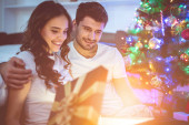 Szczęśliwy mężczyzna i kobieta otwierają skrzynkę światła w pobliżu choinki