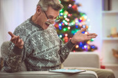 Uśmiechnięty staruszek z telefonem z karty kredytowej w pobliżu choinki