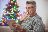 Zdjęcie "Emeryt w okularach z tabletem siedzi obok choinki" może być wykorzystywane do celów osobistych i komercyjnych zgodnie z warunkami zakupionej licencji Royalty-free. Obraz jest dostępny do pobrania w jakości wysokiej rozdzielczości do 5760x3840.
