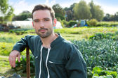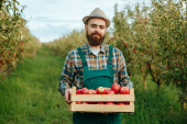 Młody brodaty biały rolnik stoi na polu i trzyma w rękach pudełko ekologicznych pomidorów.