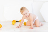 a mały szczęśliwy dziecko sześć miesięcy stary w a ciepły dzianina kurtka i niebieski dżinsy czołga się w domu w a jasny pokój