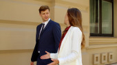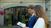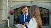 Wesoła para biznesowa wychodzi na zewnątrz. Szczęśliwi partnerzy idący do biura