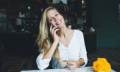 Z dołu radosna zamyślona kobieta w eleganckich ubraniach uśmiechająca się, siedząca przy stole i mająca smaczny gorący napój przeciwko zamglonemu wnętrzu współczesnej kawiarni w Rzymie