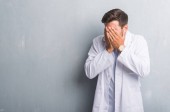 Close up widok wyczerpany pracownik biurowy z migreną, trzymając się za ręce w pobliżu zamkniętych oczu na niewyraźne tło