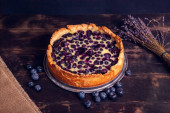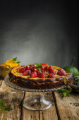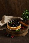 Ciasto czekoladowe na ciemnym tle. Ozdobione jagodami. Miejsce na tekst