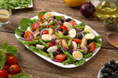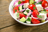 Zdjęcie "Grecka sałatka w okrągłej białej misce na starym drewnianym stole. Wybrane skupienie" może być wykorzystywane do celów osobistych i komercyjnych zgodnie z warunkami zakupionej licencji Royalty-free. Obraz jest dostępny do pobrania w jakości wysokiej rozdzielczości do 5760x3840.