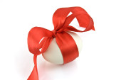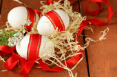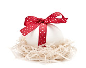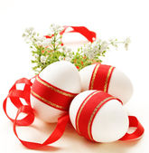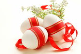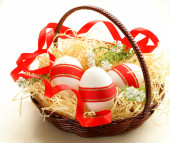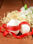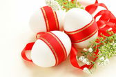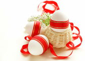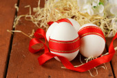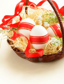 świąteczne jaja ozdobiony czerwoną wstążką - symbolem Świąt Wielkanocnych