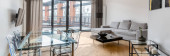 Panorama salonu z prostą, szarą kanapą narożną i czarnym stołem do kawy