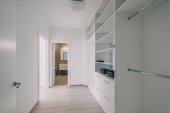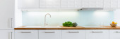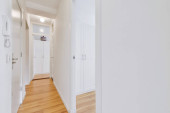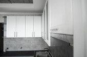 Panorama stylowej kuchni z drewnianą podłogą i blatem w szarym korytarzu nowoczesnego mieszkania