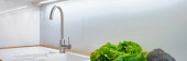 Zdjęcie "Panorama stylowej kuchni z drewnianą podłogą i blatem w szarym korytarzu nowoczesnego mieszkania" może być wykorzystywane do celów osobistych i komercyjnych zgodnie z warunkami zakupionej licencji Royalty-free. Obraz jest dostępny do pobrania w jakości wysokiej rozdzielczości do 5760x3840.