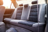 Wygodne przednie siedzenia i kierownica wewnątrz samochodu: kierowca i pasażer, związany z szarym welurem, nowoczesny wystrój wnętrza.