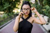 Zdjęcie "Piękna, seksowna Azjatka w stylowym stroju, siedząca przy stole w miejskiej kawiarni na świeżym powietrzu, trzymająca filiżankę kawy na wynos i patrząca w kamerę. Przerwa na kawę. Środowisko miejskie, zbliżenie" może być wykorzystywane do celów osobistych i komercyjnych zgodnie z warunkami zakupionej licencji Royalty-free. Obraz jest dostępny do pobrania w jakości wysokiej rozdzielczości do 5760x3840.